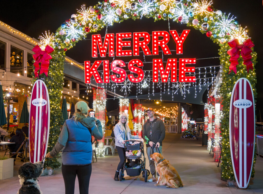 The Tearle family, Sara, 7-month-old Eloise, Sam and their dog Alfie, have their photo taken beneath the Merry Kiss Me arch during the annual holiday light display for Happy Harbor Days in Dana Point on Wednesday, Nov. 29, 2023. T(Photo by Leonard Ortiz, Orange County Register/SCNG)